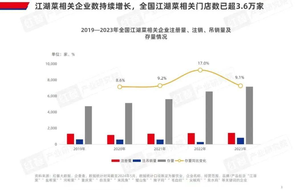 据企查查数据,2023年全国江湖菜相关的餐饮企业存量超7,000家,同比增长9.1%。意味着江湖菜赛道已进入稳步扩张期。