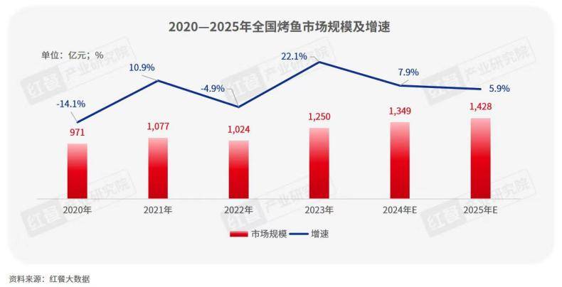 烤匠的逆势增长,并非个例,而是整个烤鱼赛道稳步发展的缩影。数据显示,过去 5 年烤鱼赛道保持平稳增长,每月新增门店数稳定在 2000 家以上;红餐大数据预测,2025 年我国烤鱼市场规模将达到 1428 亿元,同比增长 5.9%。