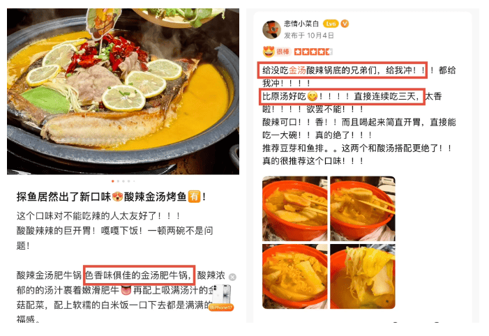 一降温,食客对热汤的需求直接迎来爆发,粉面店的汤面销量涨了3成,简餐店的例汤更是成了食客必点的标配。而在众多热汤品类里,酸辣金汤的热度格外突出:连锁品牌张亮麻辣烫推出酸辣金汤底后,不少消费者专门到店打卡尝鲜;连锁烤鱼店上线金汤味烤鱼,很快就成了门店的人气款。更值得关注的是,这股热度不只是连锁大牌在带动