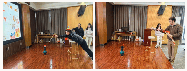 主持人温情开场后,记忆力挑战、投壶和制作圣诞挂件三个项目,瞬间点燃了大家的参与热情。投壶区域,寿星们依次排队,瞄准壶口轻轻投掷,有的精准投中引来阵阵欢呼,现场热闹非凡。