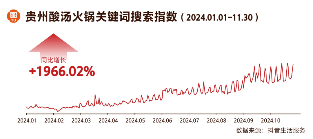 消费者对 “新鲜感” 的追求,让地域风味锅底快速走红。抖音数据显示,2024 年“贵州酸汤火锅”搜索指数同比暴涨 1966.02%,云南火锅、潮汕牛肉火锅搜索量分别增长 530.86%、65.99%。