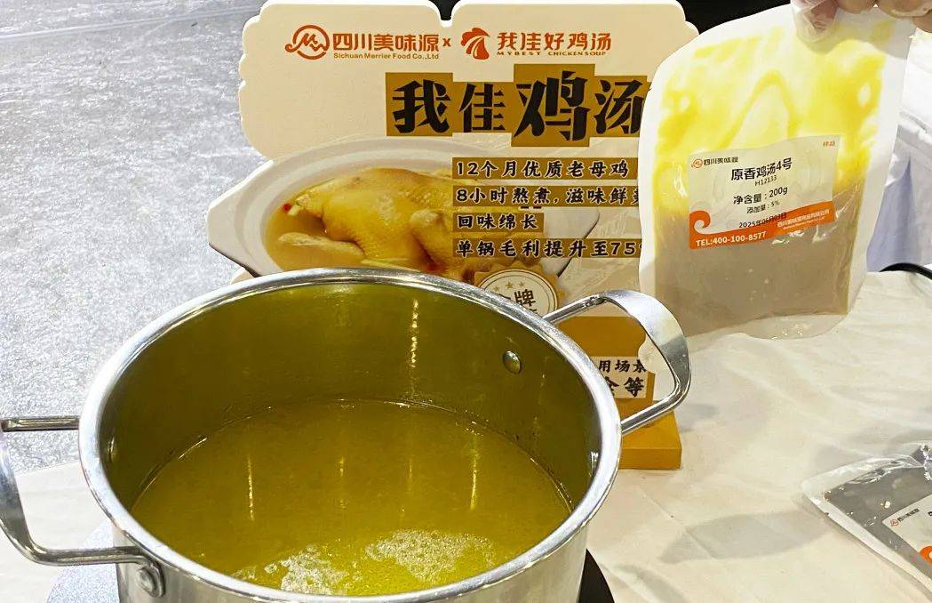 作为本次展会的流量担当,我佳鸡汤迅速捕获众多粉面品牌的关注,其选用养殖期 12 个月以上的老母鸡,历经 13 道精细熬煮工艺,汤色清黄、鲜味自然,完美适配米粉汤底需求——无论是搭配米粉的爽滑,还是面条的劲道,都能提升汤底层次,单碗毛利可达 80%!
