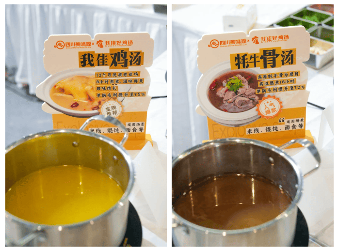 汤料作为四川美味源的明星产品,此次展会鸡汤同样大放异彩。我佳鸡汤用365天散养老母鸡,13道工艺慢炖8小时,完全替代传统手工熬汤,汤汁清亮无渣,鲜醇度比同类竞品高约30%。