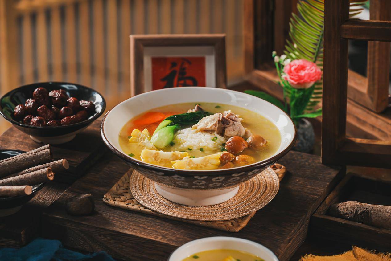 ✅ 核心亮点:鸡汤中加入蒸熟的板栗、玉米、胡萝卜,汤底自带自然清甜,口感层次丰富;搭配喷香米饭,一碗就能满足“暖身+饱腹”需求,“秋冬限定”标签自带尝鲜吸引力。