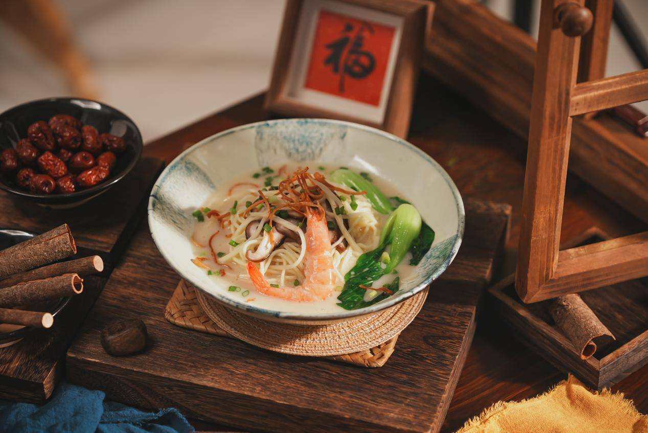 ✅ 核心亮点:鸡汤打底后用热油炝香葱花、蒜末,激发虾干、香菇、茭白的鲜爽滋味,解决北方客群“秋冬想吃重口但怕腻”的痛点;选用手工碱水面,筋道有嚼劲,裹满汤汁越吃越香。